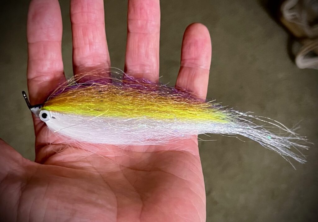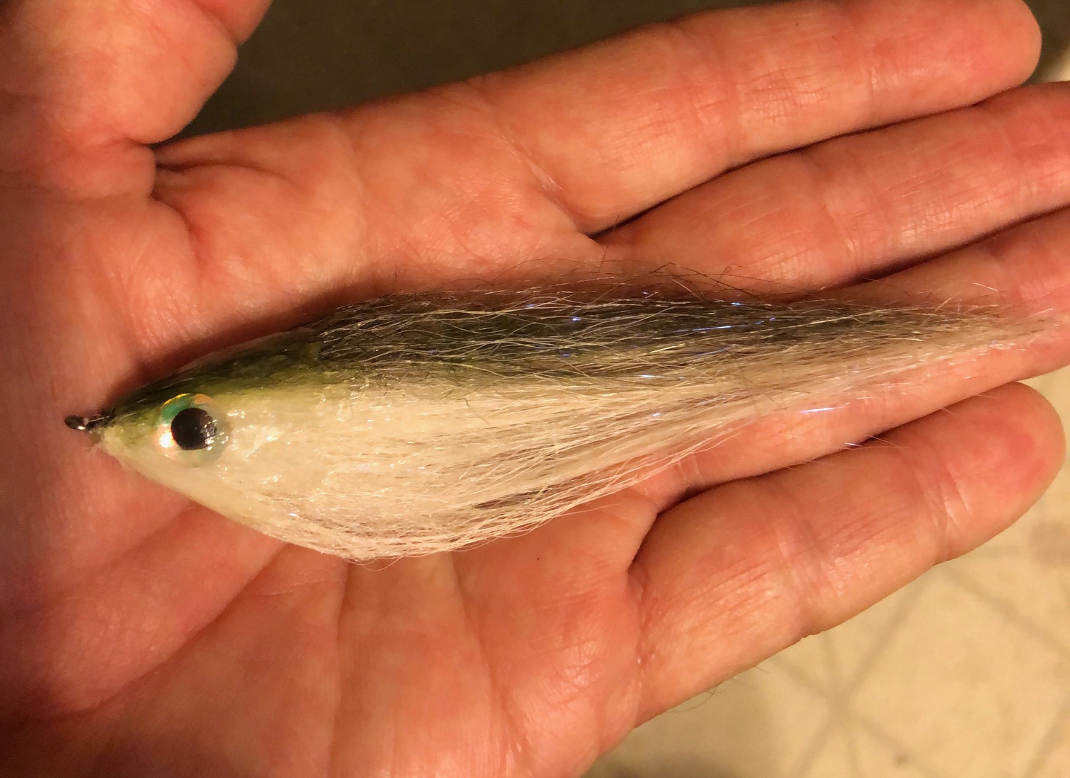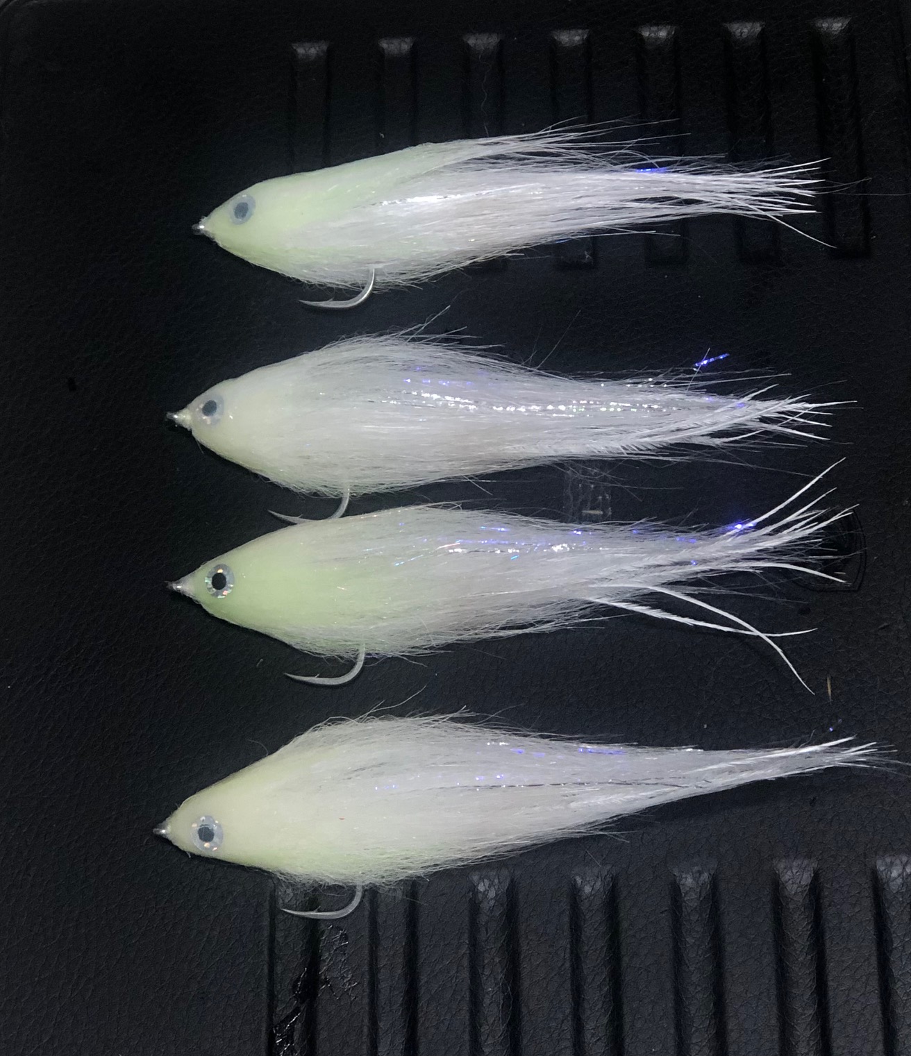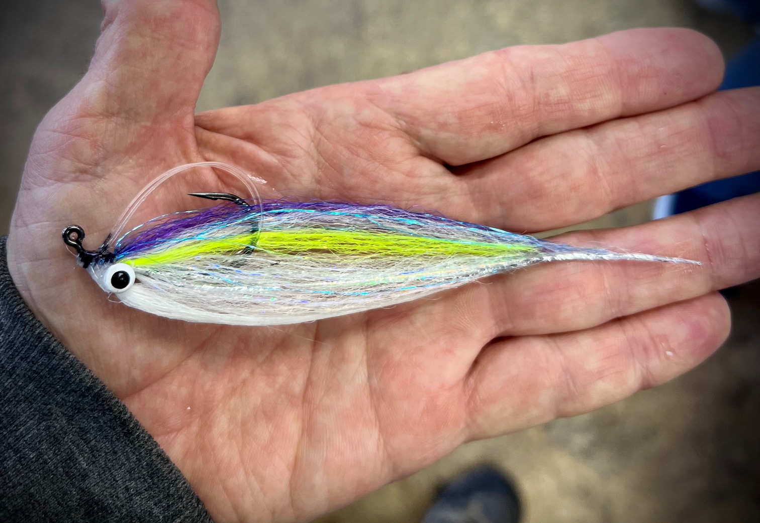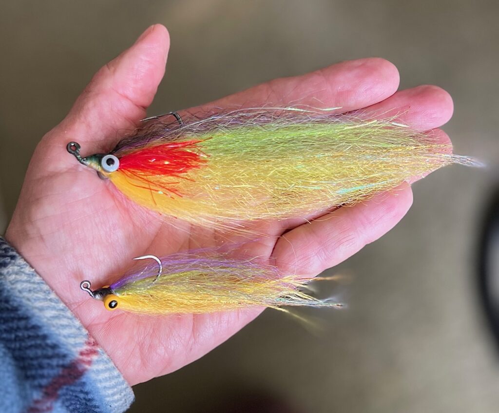 The usual clousers in olive and white and olive and yellow and many other baitfish patterns will produce for you just fine in sizes 2 to 2/0. Intermediate as well as fast sinking 24 to 30 foot integrated sink tips are the lines of choice. I like a six foot leader of fluorocarbon, 15 to 20 pound test.