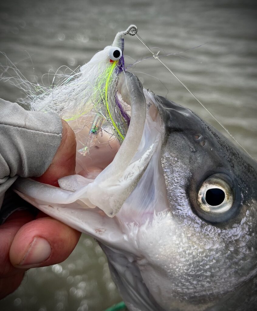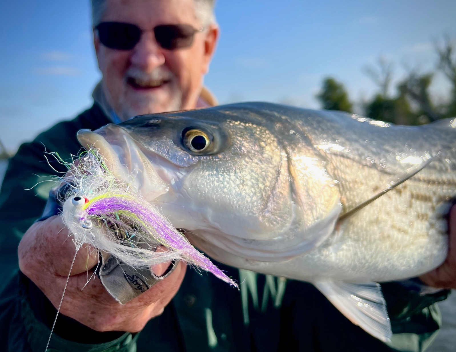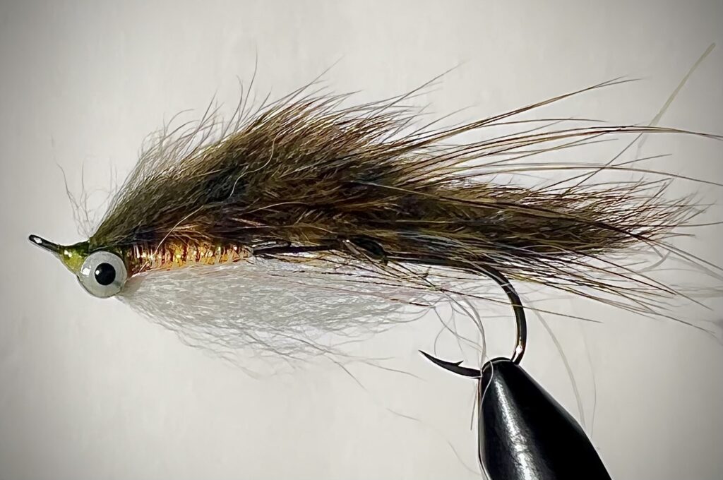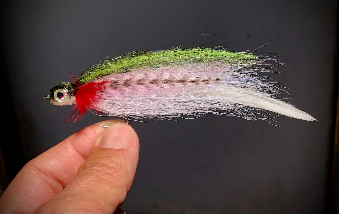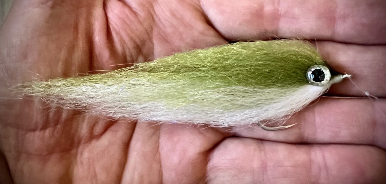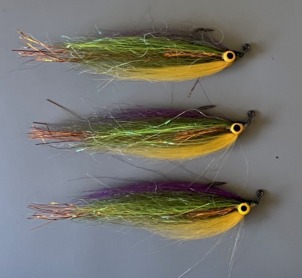 The usual clousers in olive and white and olive and yellow and many other baitfish patterns will produce for you just fine in sizes 2 to 2/0. Intermediate as well as fast sinking 24 to 30 foot integrated sink tips are the lines of choice. I like a six foot leader of fluorocarbon, 15 to 20 pound test.