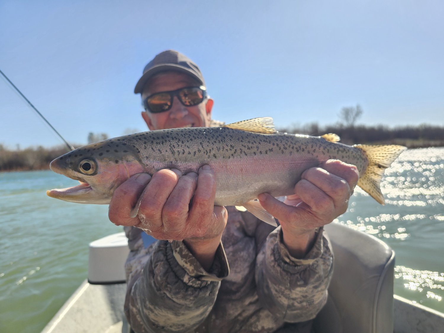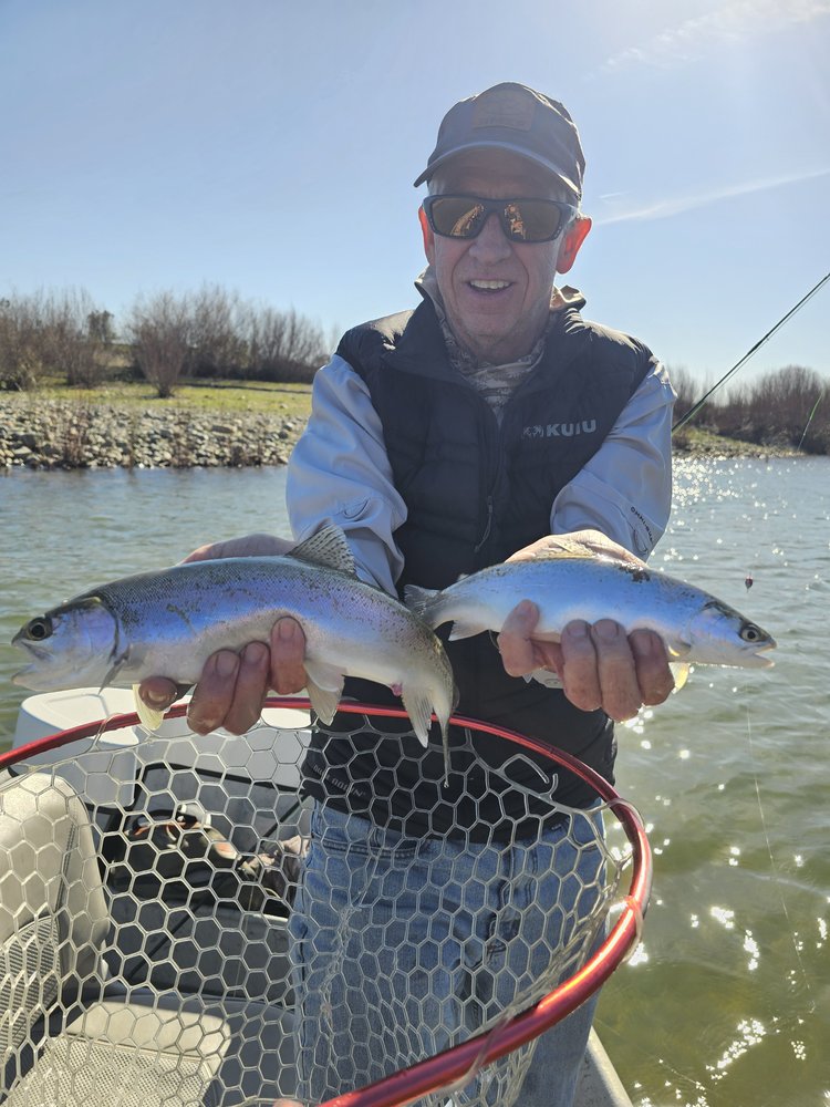 I have been on the yuba a lot over the last two weeks. Flows have been up and fluctuating a bit largely between 4,000 cfs and a bit over 5,000 cfs. These bigger flows keep most people off of the river so we have been enjoying quiet floats without seeing another angler most days. The dry fly fishing has not been good but the nymph game has been excellent. At the bigger flows the fish will sit in the softer water on seams and inside corners and in slower flats. We have seen a good variety of bugs from march browns, skwalas, caddis, pmds, baetis, little yellow sallies and midges- but they are pretty sporadic and the hatches are not big, it is a bug here and there. They have been consistently eating rubberlegs and sucker spawn, along with the nymph version of whatever else is hatching in the afternoons. Peaches and cream, birds nests and s&ms have seen some good action as well. We have also been finding a few smaller hatchery steelhead in the river that are likely lost feather fish.